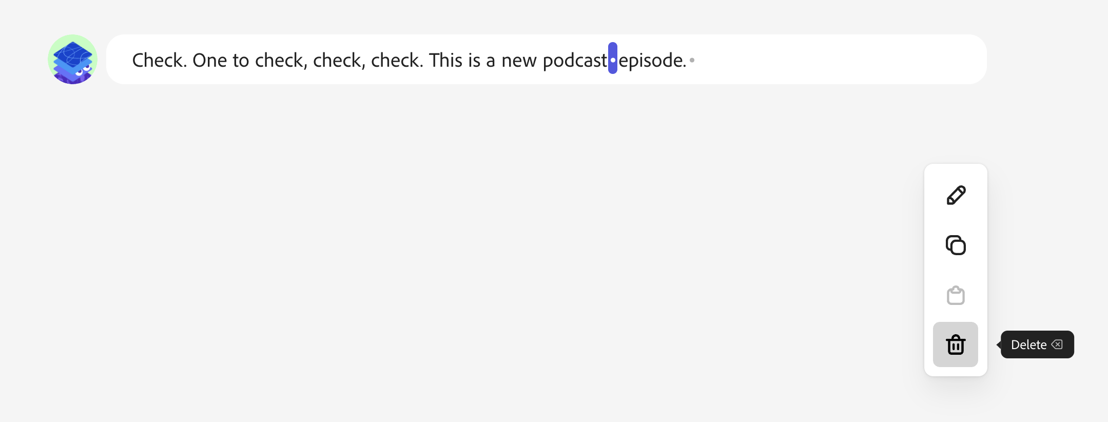 Highlight text in your transcript to edit the transcript. Press the delete button to delete the highlighted section (and it's corresponding audio) from your project.